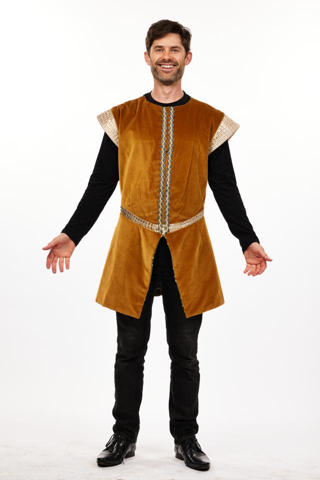 Men's medieval tunic in blue with decorative red and gold trim.