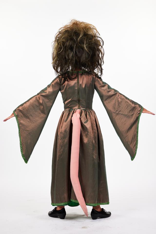 Show stopping villainous Queen Rat dress designed for Dick Whittington (pantomime). Size 6-8. Would be a great fit for an actress height 5ft. Fabulous bespoke dark blonde matching wig on soft cap with sewn in rat ears and crown. Beautiful green/brown faux-silk material. Lime green centre panel in the built in under skirt. Long premium quality fur chest piece (sewn-in). Long trumpet sleeves. Green sparkly trim round the edge of the sleeves and of the dress. Handy zip fastening at the back. 3ft pink rat tail on separate velcro waistband which pokes through a purpose built opening at the back of the dress at the waist. Dress and Wig are available as separate hires under the Entries Queen Rat Dress and Queen Rat Wig. Shoes not included.