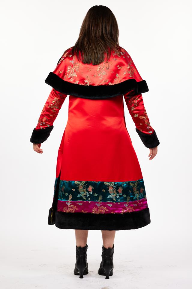 Women's calf length luxurious Chinese shot silk red tunic dress with long sleeves and black faux-fur trim on the cuffs and hem. A short shot silk red cape with Chinoiserie design and faux-fur trim is worn over the shoulders. Complementary coloured shot silk chinoiserie design fabric around the bottom of the dress. A cute comedic panda motif adorns the front of the dress. Suitable for a pantomime princess. Shoes not included.
