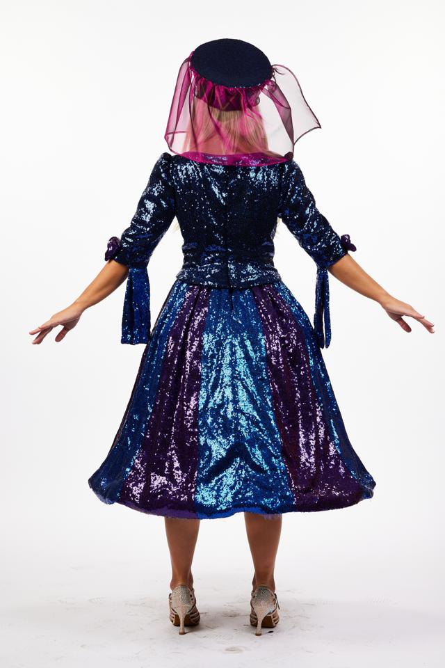 Women's calf length shimmering medieval style dress comprises of a hooped skirt made of blue and purple panels, a blue bodice with gold lacing at the front. Three quarter length sleeves decorated with sparkly pom poms and short flowing fabric pieces. Costume has a sparkly blue matching hat with gold trim and short purple veil. Perfect for a pantomime Princess. Shoes not included.
