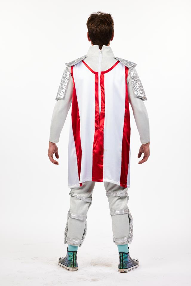 Men's comic suit of armour comprises of a white tabard with target motif and attached prop arrow in the centre. The tabard has red shiny vertical stripes decorating the front and back. The tabard is worn over a white long sleeved top which has comic faux metallic fabric on the shoulders and upper arms to represent metal armour. This costume includes a pair of white trousers with faux metallic fabric designed to look like armoured shin pads. Suitable for a comedic knight/Prince or villain. This costume was used in a pantomime production of Robin Hood. Chest size 42. Shoes not included.