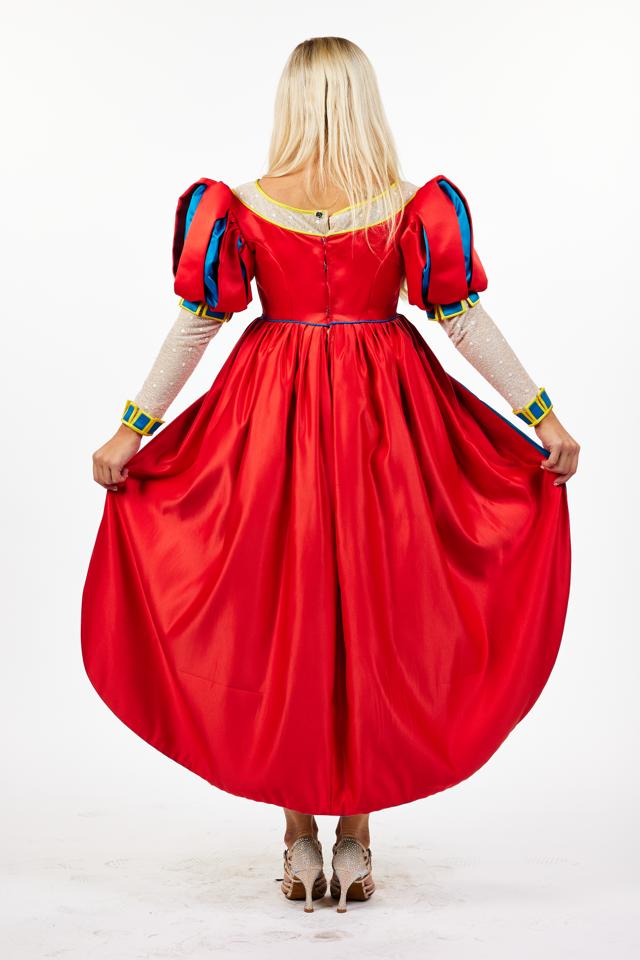 Women's Snow White style dress comprises of a yellow faux silk ankle length skirt, red faux silk bodice and split leg of mutton sleeves with contrasting blue lining. The yellow skirt is overlayed with a red over skirt and contrasting blue faux silk lining. The square neckline bodice, sleeves and cuffs are decorated with blue squares trimmed in gold. This pretty dress is trimmed around the waist with a chord belt and tassles. Suitable for any pantomime Princess or Queen. Size 6 to 8. Shoes not included.