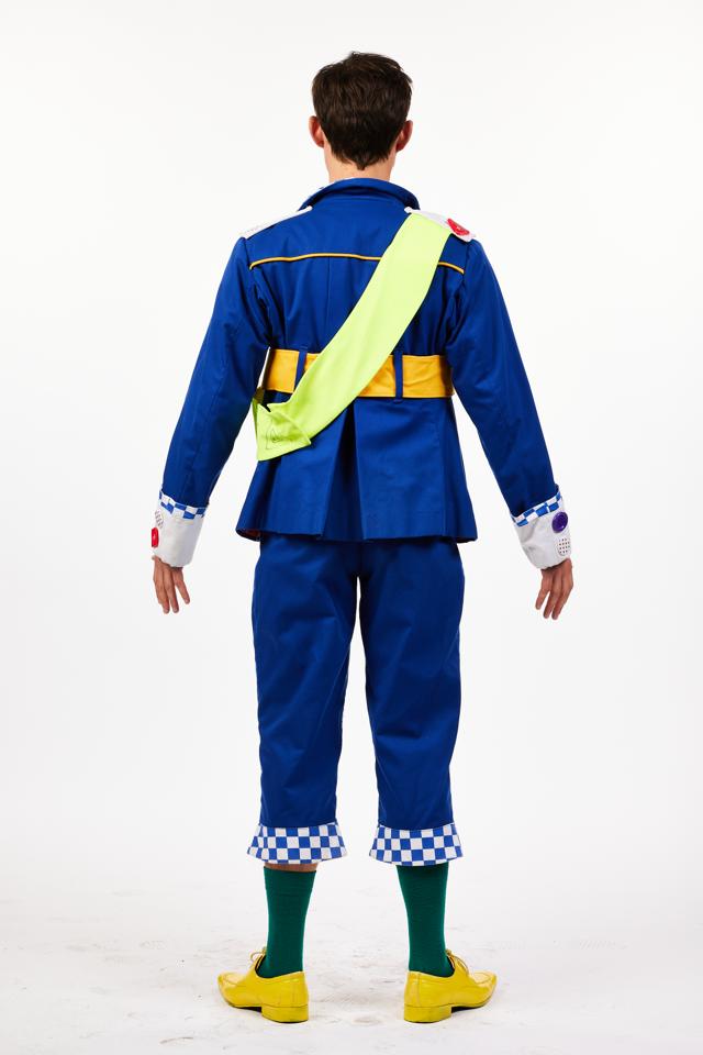 This comedic men's suit/uniform comprises of a blue long sleeved jacket with oversized white cuffs trimmed with checkered blue and white fabric. A high waisted contrasting yellow belt with large buckle, oversized pockets, buttons and "Cycling Proficiency" sash for comic effect. Adding to the humour are a pair of flood length pants with blue and white checkered fabric at the hem. A polkadot patch on one pant leg completes the fun of this outfit. Great for any comedy/clown routine in a pantomime. Fits chest size 38. Shoes not included.