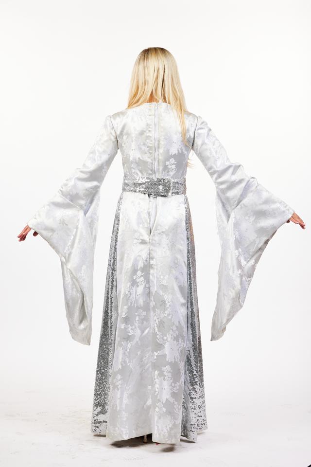 Stunning women's medieval white, floor length dress, complimented with long, wide, trumpet sleeves. This gorgeous gown is white satin fabric with inlaid floral design and has a sparking silver sequin belt and over skirt. Looks fabulous under stage lighting and glows well in UV. This gown would be perfect for any pantomime princess or Ice Queen. Size 8.