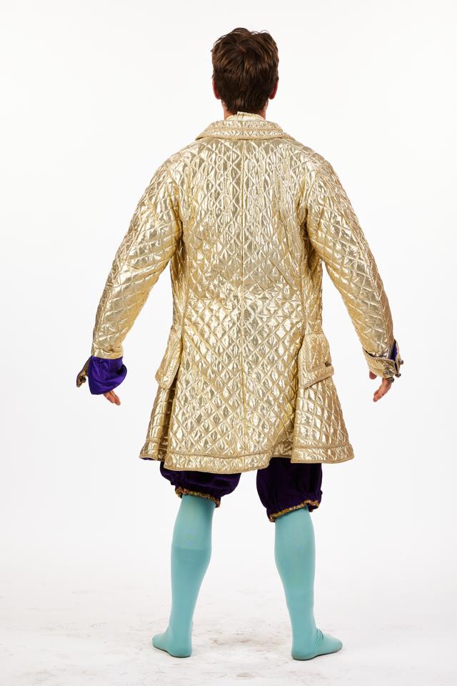 This men's Regency-style costume comprises of an opulent, gold quilted, long sleeve jacket worn over a long cream waist coat with gold brocade trim. A pair of purple velvet knickerbockers with gold brocade trim and purple cravat complete this royal look. Perfect for any pantomime prince, particularly one that is Charming. Suitable for pantomimes such as Cinderella, Sleeping Beauty, Beauty & the Beast. Chest size 44. Tights not included.