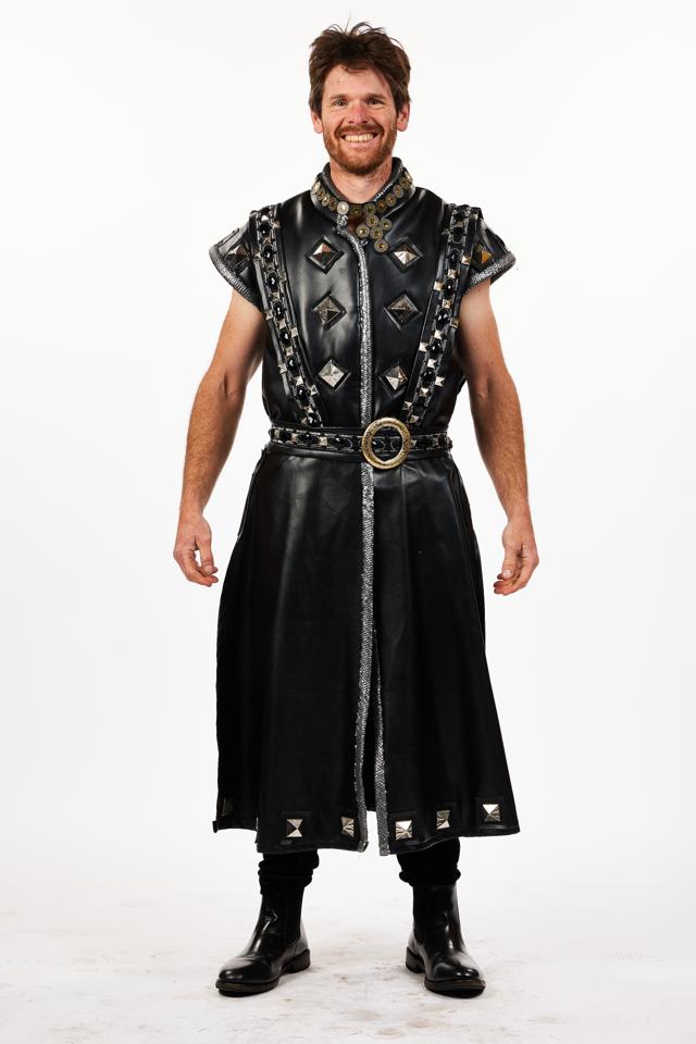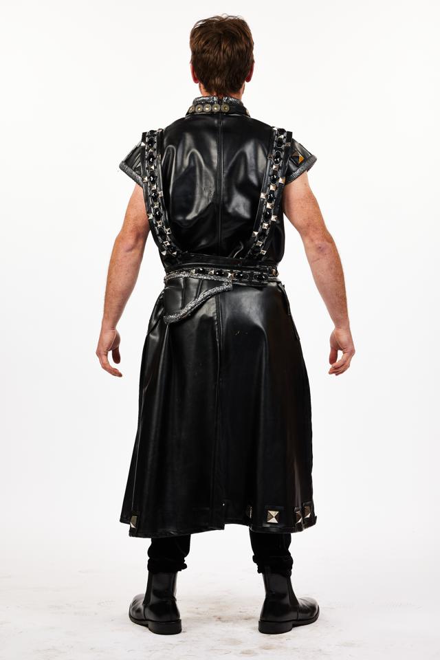Men's Medieval, faux black, calf length, leather armour adorned with metal studs and large belt buckle. The armour is worn as a tunic over black trousers with elasticated waist, which are included. Perfect for a pantomime henchman. Chest size 44. Black faux leather boots can be hired separately. Medium-Large, M-L.