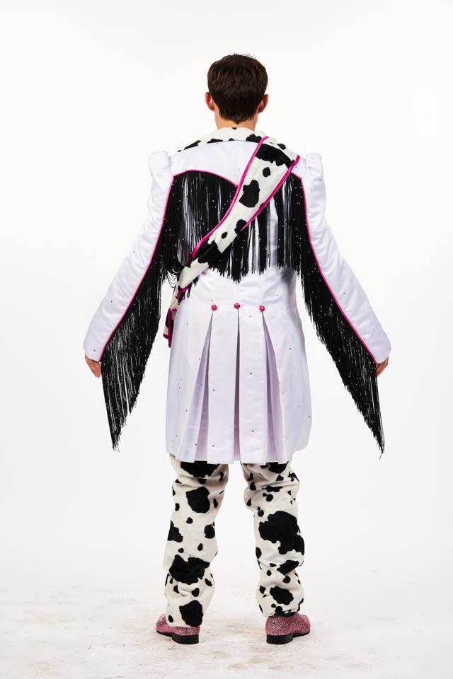 Men's comedic cow costume, long pleated white jacket with cow print waistcoat.