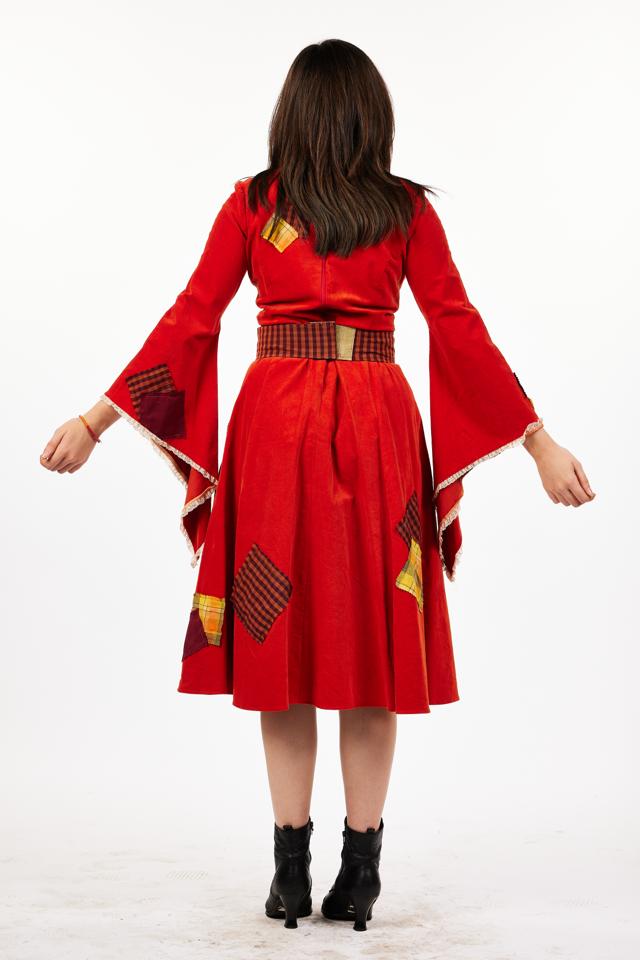 Women's Princess/Villager dress in cherry red, plaid apron, patches on skirt and sleeves