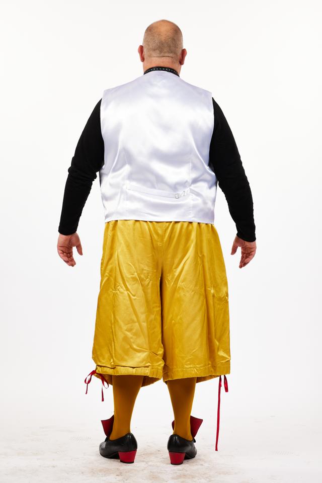Men's patriotic Union Jack waistcoat and matching bowtie. Union Jack design on the front in bright red, white and blue satin fabric. The back of the waistcoat is comprised of plain white satin fabric. The front of the waistcoat has two faux pocket slits trimmed in blue. The waistcoat comes with a matching Union Jack bow tie. Suitable to be used in a comedic scene in pantomime or for any patriotic celebration. Size XL. Yellow pantaloons, shoes and tights are not included, but can be hired separatley.