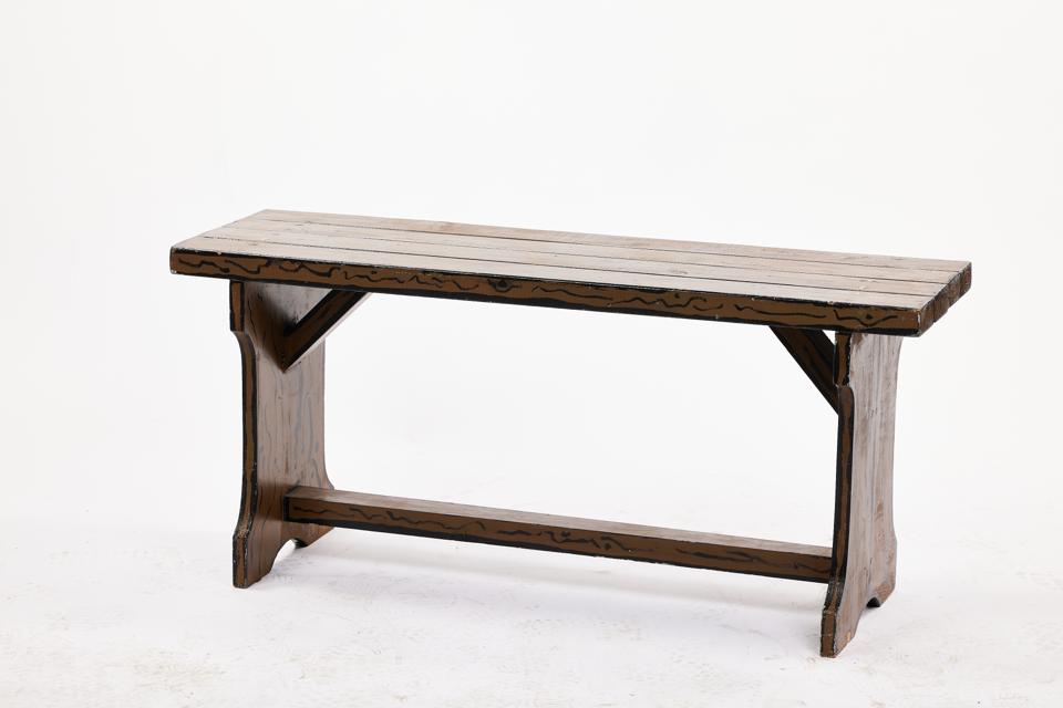 A simple wood bench that has been used for a ghost gag in a pantomime, sturdy and yet light enough for a quick scene change.
