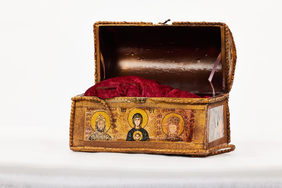 Beautiful Medieval reliquary style box. Painted Iconography of religious figures on the box in realistic medieval illuminated style with gold cording around the edges. Opens to reveal a red velvet cushion and plain brown painted interior.