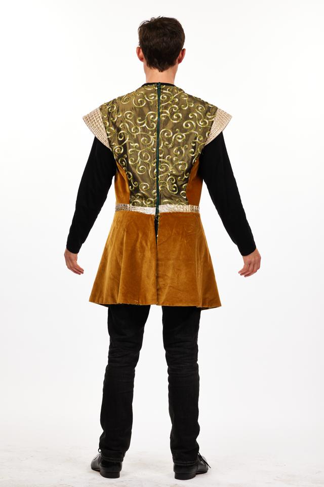 Gold brocade trim and a panel of gold and green brocade fabric decorate this medieval tunic with panelled skirt. Great for a villager or guard, can be worn over stage blacks or paired with undershirt, hose, and leggings Size 38" chest. Medium, M. Stage Blacks not included in this hire.
