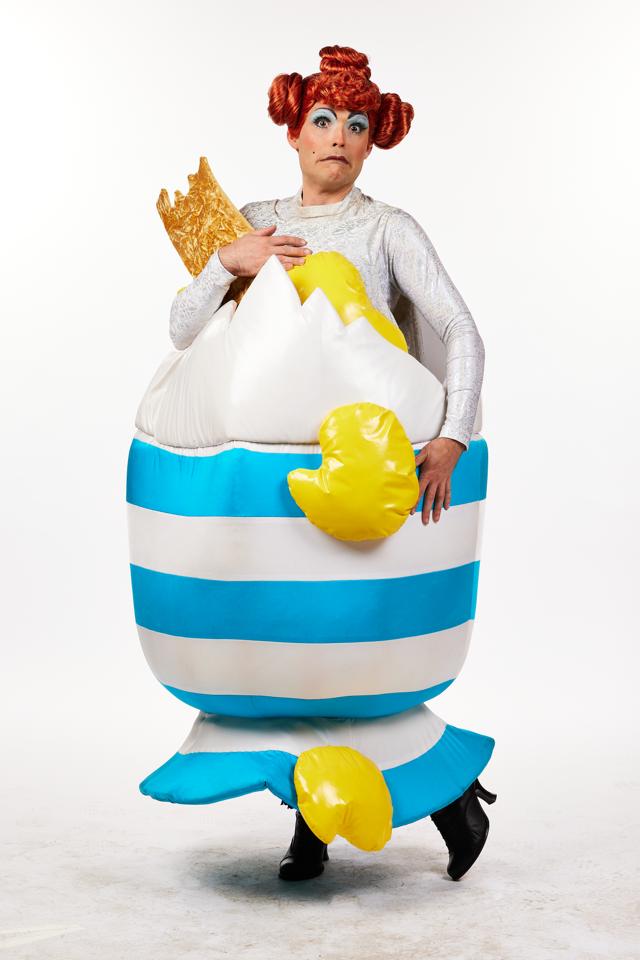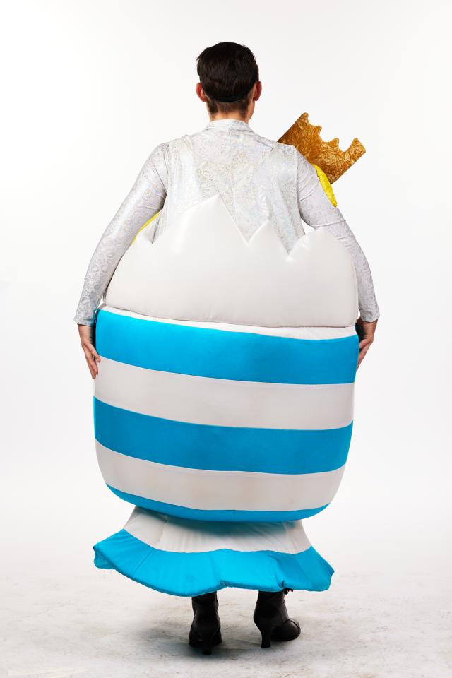This costume really is no yoke! Your dame will be up and ready for breakfast in this boiled egg in egg cup costume. Blue and white striped egg cup and egg shell made from blue and white fabric covered foam with yellow yolk splodges and toast soldier dipped in. Silver body suit covers your dames chest and arms. Worn over the top (you get in via the hole in the bottom of the egg cup) this is a very funny visual gad that will definitely Eggs-cite your audiences. Size M-L, Medium-Large.