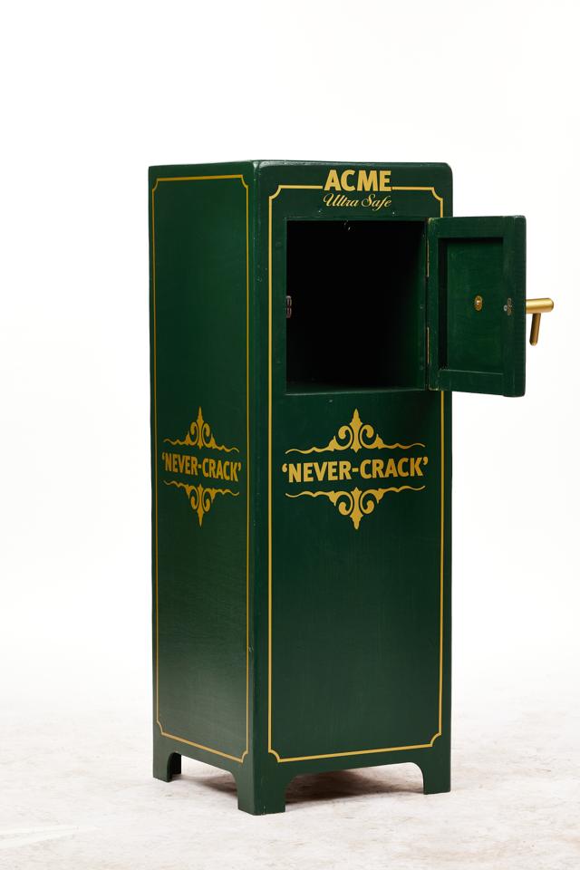 The Acme 'Never Crack' safe is the place to keep all your valuables, just make sure that you don't let any nefarious villains know what the combination is! Distinguished green and gold decoration adorns this majestic, yet light weight, free standing prop. the combination dial turns as does the gold handle/lock. there is a deep black interior perfect for all your character's valuables. It also has a hook screwed into the top of the vault space which was used to hang a diamond necklace for all to see. Originally created for a fantastic production of Dick Whittington. Dimensions height 113cm, depth 40cm, width 40cm. Note This is not a real safe.
